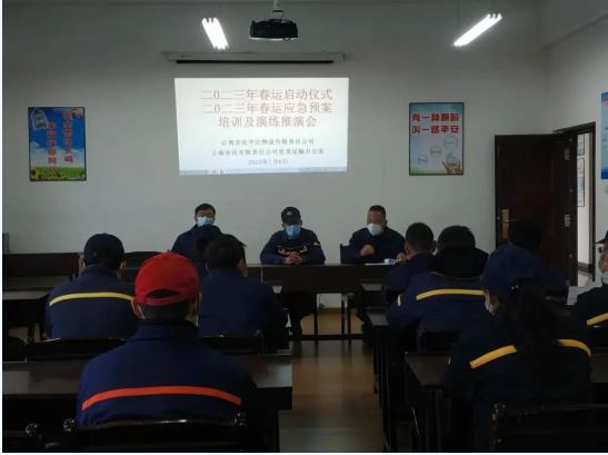 演練開始前,中達物流公司總經(jīng)理張睿、副總經(jīng)理張金元、安化公司危爆辦主任王現(xiàn)平組織參演人員在中達會議室進行2023年春運啟動儀式、春運應(yīng)急預(yù)案培訓(xùn)及演練。