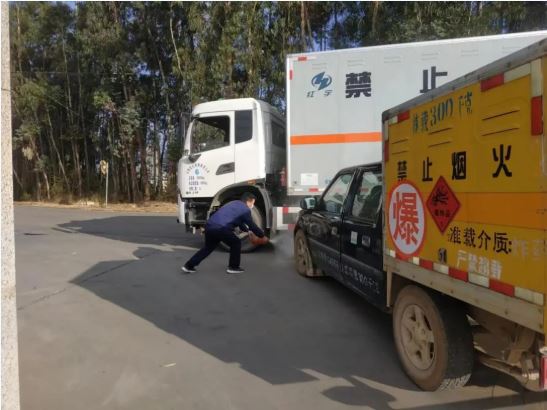 演練模擬2023年1月6日9時30分,安化駕駛員郭濤駕駛云AK5721號重型廂式貨車由安化安寧分公司前往安寧(北向南),行至中達停車場門口時,遇中達駕駛員許北云駕駛云AY7U27號輕型廂式貨車行駛至此(東向西),因該路段為右轉(zhuǎn)彎路段、柏油路面,加之因下雨導(dǎo)致路面濕滑,許北云駕車時對路面動態(tài)觀察不足,致本車左前車頭與郭濤駕駛的云AK5721左側(cè)油箱相撞,導(dǎo)致云AK5721號車油箱漏油起火。